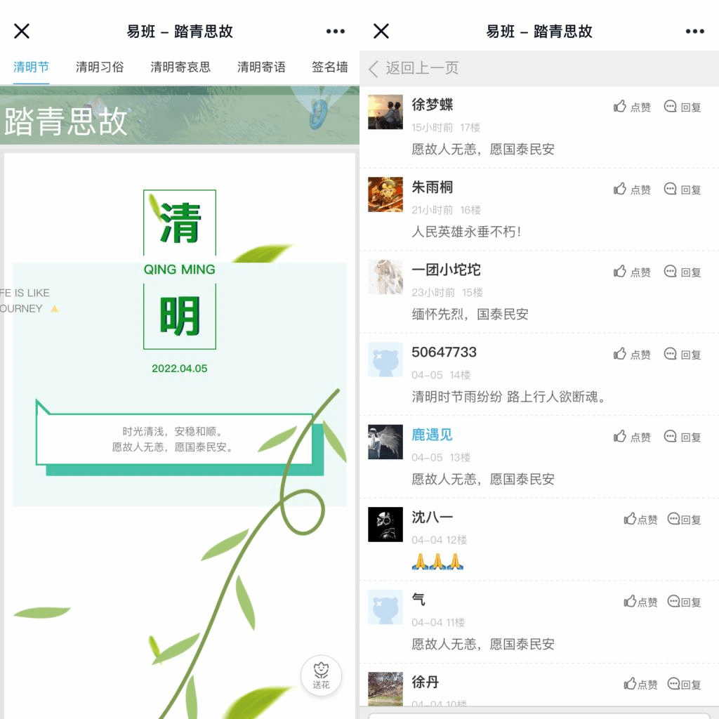 本次活动为期三天,以“踏青思故”易班轻应用为载体,精心设计清明节、清明习俗、清明寄哀思、清明寄语等模块,院学生积极参与,反响强烈。其中清明节和清明习俗模块简要介绍了中国这一重要传统节日的由来和清明期间人们固有的踏青、放风筝习俗。当下疫情犹在,“隔空”踏青、“云”祭扫赋予了传统习俗新的形式,在清明寄哀思、清明寄语模块,同学们通过指间轻触手机屏幕,让对先烈的缅怀和故人的思念在指端蔓延,一句句朴实的寄语,一份份浓厚的哀思,实现了与先人的时空心灵对话,倾诉也在清明寄哀思中“被看见”。