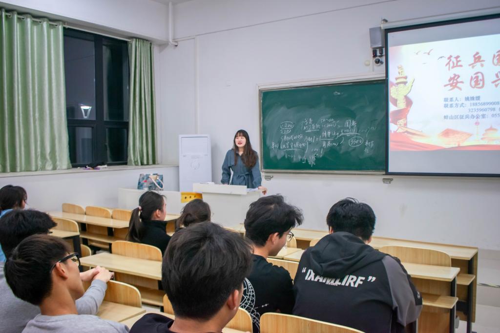 会上,学院征兵工作负责人姚姝媛老师从三个方面为同学们进行了讲解。首先为同学们介绍了2022年征兵工作的预征对象的条件和要求,简要介绍了国防部颁布的《应征公民体格检查标准》和有关规定。其次重点介绍了大学生预征报名的简要流程中的网上登记、初审初检、体检政审、体检政治考核、预定新兵和批准入伍等必要条件。并就同学们关心的征兵入学、就业创业、经济补助等方面政策进行了详细的解答。最后,姚姝媛播放了《2022年征兵宣传片》,并表明大学生入伍对于自身塑造和锻炼成才的重要意义,勉励同学们应关注应征入伍相关工作。