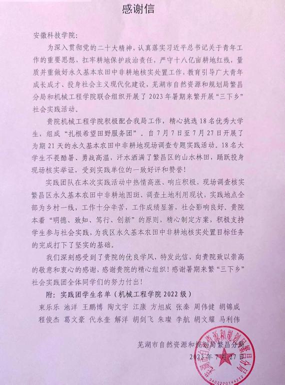 近日,芜湖市自然资源和规划局繁昌分局向乐鱼平台_乐鱼(中国)一站式服务平台寄送感谢信,感谢机械工程学院精心组建的“扎根希望田野服务团”暑期“三下乡”社会实践团给予该局在做好永久基本农田中非耕地核实处置工作工作中发挥的积极作用。