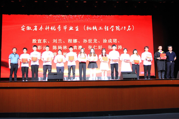 在毕业典礼暨欢送晚会现场,张程宣读了安徽省教育厅、人力资源和社会保障厅、共青团安徽省委联合下发的关于表彰高校2022届优秀毕业生的决定,其中:机械工程学院共有13名学子获评为2022年“安徽省本科优秀毕业生”,陈丰、张严政为13位优秀学子颁发了荣誉证书和纪念品,同时对荣获“乐鱼平台_乐鱼(中国)一站式服务平台优秀毕业生”的45名机械学子进行了表彰。