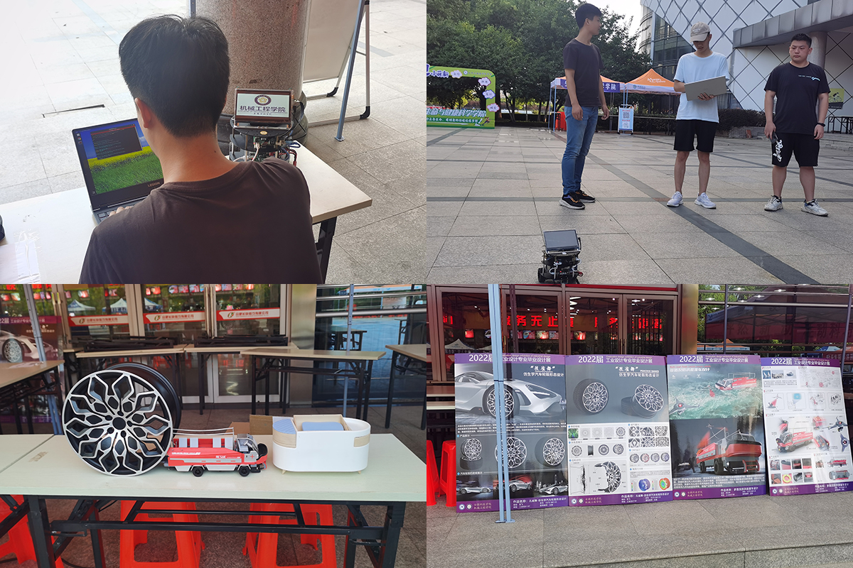 展场上,众多机械学子自主设计的各类创意产品模型有序摆放,有静态模型海报展板,还有“孔雀舞”仿生轮毂模型、多路况防洪救援车模型、多功能婴儿床模型、智能无线遥控视频车等多种产品模型。
