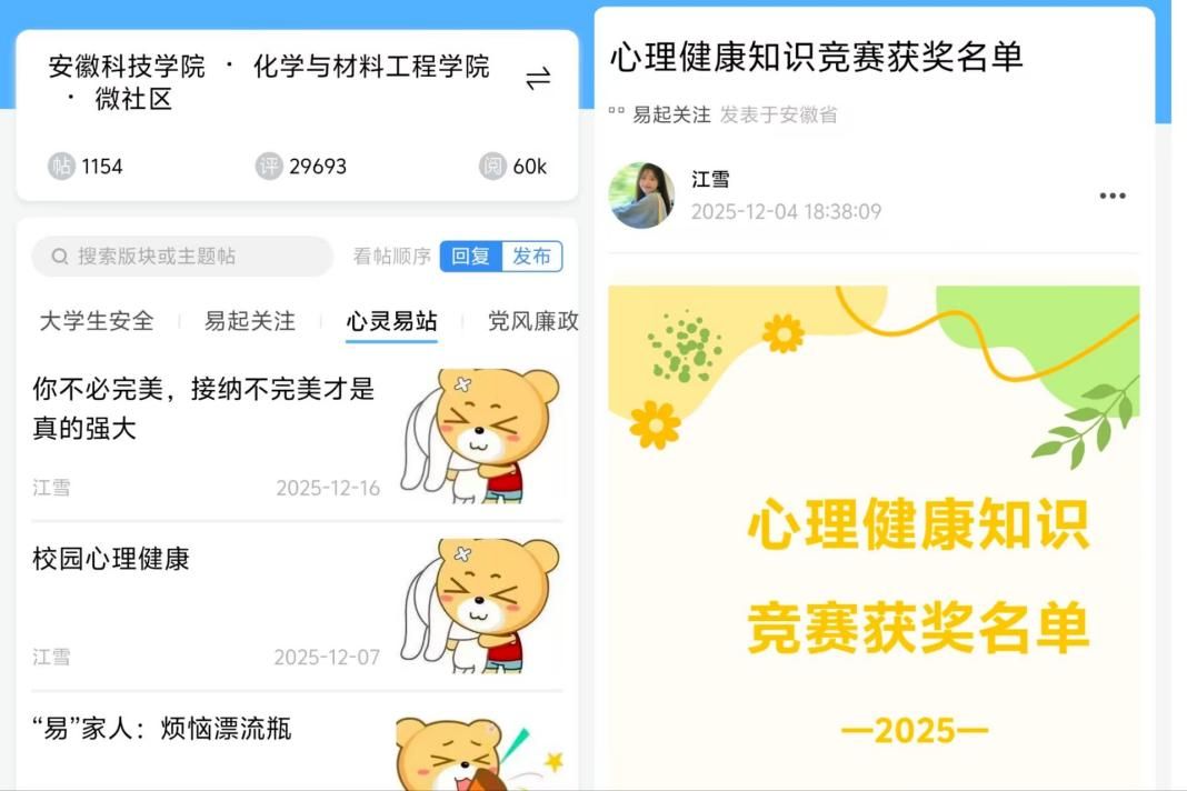 为满足学院学子们不同的参与需求,学院依托易班平台打造线上心理健康专区,推出系列特色活动。“心灵易站”栏目连续推出三期推文,以生动直观的形式分享解压技巧;“烦恼漂流瓶”等互动话题吸引同学们线上留言分享烦恼和应对技巧;依托易班线上课群开展“心理健康知识竞赛”,打破时空限制,让同学们随时获取心理健康资源,形成“线上+线下”全方位、立体化的心理健康教育格局。
