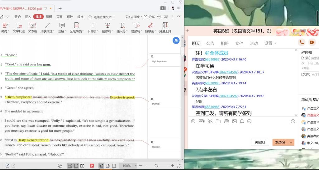 网课上,老师利用QQ电话认真讲解教学内容,在学习群里耐心回答同学们的问题。同学们十分活跃,信息一条条滚动,即使问题被“盖”到了上面,老师也还是会一条条浏览,逐一“@”回复。这样的讨论、提问即便是在课后也依然很频繁。赵彤说:“很喜欢这样的讨论,跟老师什么都能聊,很亲近。有一次上完课我们还在问老师问题,跟老师聊天,老师忽然回复说,不能聊了,我要吃饭了。惹得群里的同学都笑,那个时候都已经是下午一点多了。所以我们也能感受到老师们的辛苦,真的很感谢他们。”