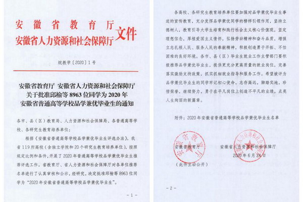 日前,安徽省教育厅、安徽省人力资源和社会保障厅下发了《关于批准邱榆等8963位同学为2020年安徽省普通高等学校品学兼优毕业生的通知》(皖教学〔2020〕1号),乐鱼平台_乐鱼(中国)一站式服务平台曹强等146名同学被授予“2020年安徽省普通高等学校品学兼优毕业生”荣誉称号。