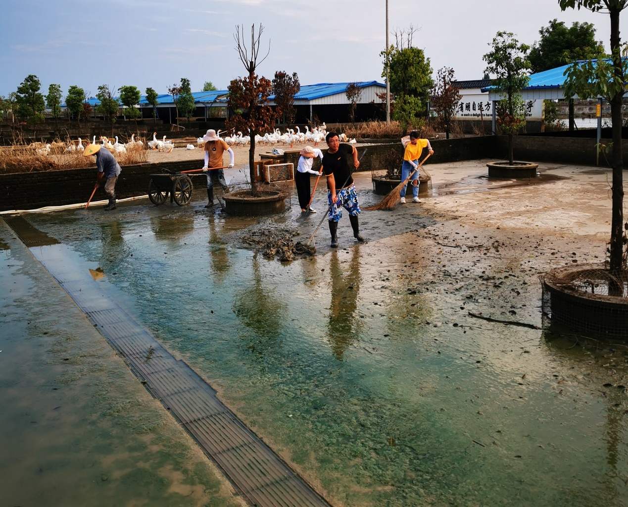 志愿者们达到现场后,顾不上休息,立刻投入到鹅厂重建工作中。他们帮助清退洪水,转移鹅苗孵化设备、清理屠宰车间废墟,洗刷清扫鹅舍卫生,寻找并清点剩余鹅苗数量,配备鹅苗饲料,做好鹅厂灾后卫生防疫工作。特别是2019级畜牧领域研究生徐茂森,洪水之前就一直在基地参观学习,帮助鹅厂养殖鹅苗。发生灾情之后他更是不顾危险,奋战在抗灾一线。镇上断水断电断网,条件非常艰苦。徐茂森不仅帮助消防员把镇上老人和小孩转移到安全地方,协助政府人员发放救灾物资,同时在人员安排妥善后,又随基地工作人员一起划船几公里寻找被大水冲走的皖西白鹅,以及被大水冲走的场内物品。
