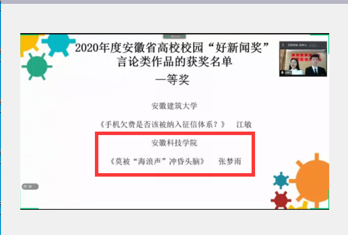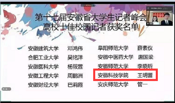 12月26日,以“‘后浪’奔涌,薪火承志”为主题的第十七届安徽省大学生记者峰会圆满落幕,本次会议采取腾讯会议线上举行,峰会对2020年度全省高校优秀新闻作品进行了表彰,乐鱼平台_乐鱼(中国)一站式服务平台新媒体中心再续辉煌,再次诞生全省“十佳校园记者”一名,言论类作品首次实现一等奖的突破。