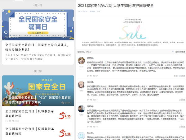 多渠道多形式宣传国家安全教育日。党委学工部精心制作了《4.15国家安全教育日你需要知道的小知识》《国家安全没有局外人》《反邪教警示教育进校园》等十余篇推文,通过“安科学工”公众号广泛开展国家安全知识宣讲。“安科易班”进行专题推送,以网络答题方式普及国家安全教育知识,千余名学生在线参与“2020年国家安全教育知识竞赛”,检验和巩固学习成果。“易家电台”辅导员专栏推送原创音频《大学生如何维护国家安全》在全校掀起了讨论学习国家安全知识的热潮。