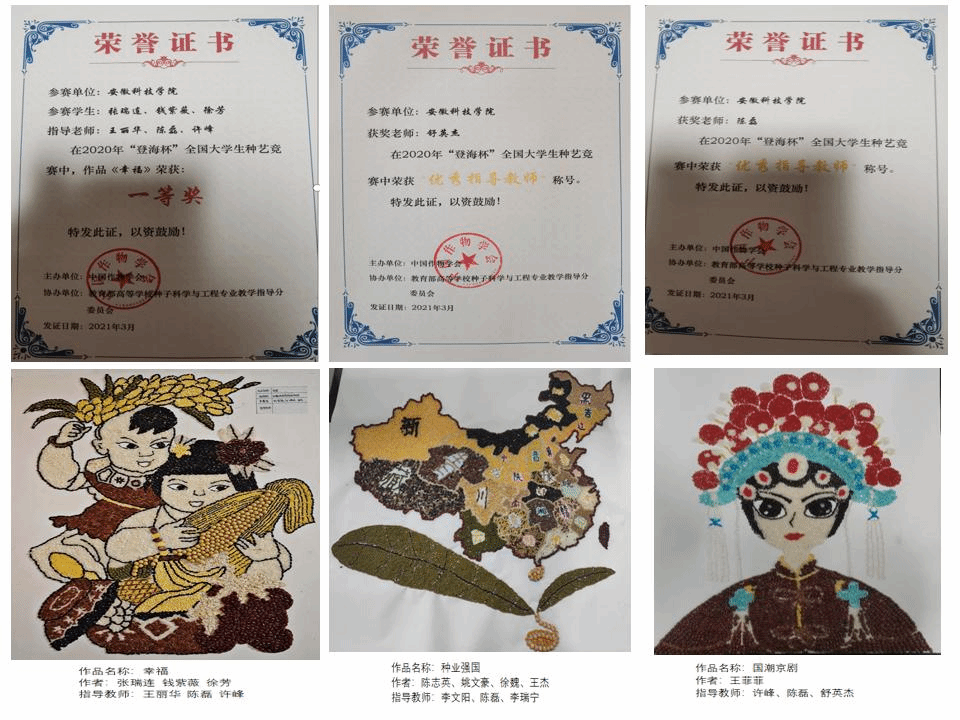 本次大赛的主题是“聚合发展向心力,共筑种业强国梦”,旨在培养大学生“学农、爱农、知农”的三农情怀和探索自然奥秘的创新能力,要求参赛者以种子为素材,以“种业强国”为主题,自拟作品题目,充分发挥专业优势和创造力,制作种艺画、种艺LOGO或种艺创作小视频。组委会共收到来自全国41高校的637件作品,经过复赛和决赛,150件种艺件作品突围,其中特等奖1名、一等奖6名、二等奖7名、三等奖61名、优胜奖75名。乐鱼平台_乐鱼(中国)一站式服务平台提交的种艺画《希望》荣获大赛一等奖,《种业强国》《芒种》《国潮京剧》《太空孕育结晶》四件种艺画获三等奖,舒英杰老师和陈磊老师获“优秀指导教师”称号。
