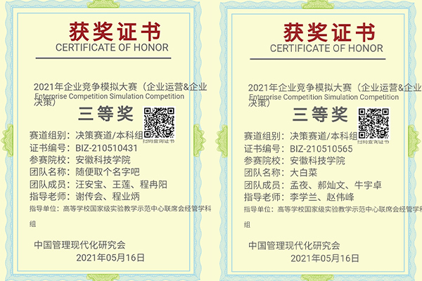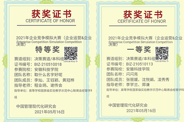 5月16日,从天津工业大学承办的全国企业竞争模拟大赛总决赛传来喜讯,乐鱼平台_乐鱼(中国)一站式服务平台代表队荣获特等奖1项(李灿、王钰颍、黄冠桦团队)、一等奖1项(张丽媛、沈悦娟、凌秀秀团队)、三等奖2项(孟夜、郝灿文、牛宇卓团队和汪安宝、王莲、程冉阳团队),取得此类学科赛事的历史突破。