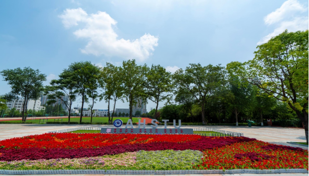 走进凤阳校区东校区大门,在小广场上映入眼帘的是用鲜花摆放的巨幅画卷,整幅画卷以绿色为基调,在阳光的照耀下显得朝气蓬勃富有生命气息,从上俯瞰左上角是一枚党徽样式,以及“100”字样,表示庆祝建党100周年,画卷从左到右是一条长长的红色“河流”,象征着党的红色精神源远流长。五四广场前一团红艳似火的花团格外显眼,以党旗为背景,书写着“学党史,强信念,跟党走”,彰显了坚定不移跟随党的领导,听从党的指挥的坚实信念。龙湖校区图书馆前喷泉和花团相呼应,美感大增。同时在学生食堂、图书馆、教学楼、办公楼等入口摆放了鲜花和绿植,花团锦簇,欣欣向荣,营造出一片喜庆、活泼的校园环境。
