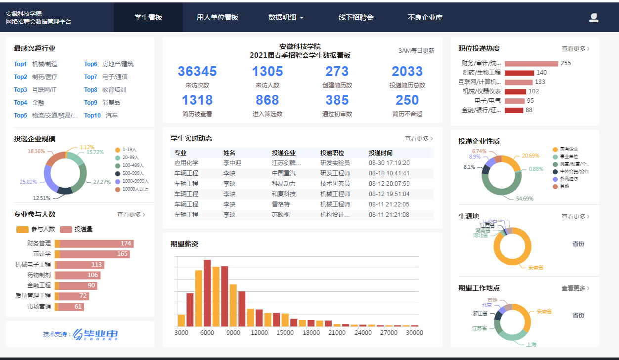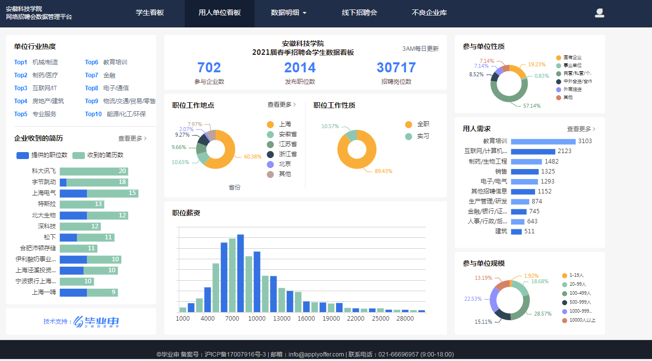 根据2018-2020三个年度毕业生就业质量报告,乐鱼平台_乐鱼(中国)一站式服务平台毕业生省外就业主要面向长三角核心地区,其中,在沪就业比例一直在10%以上。毕业生去向就是就业工作取向,学校加强长三角区域就业布局,作为毕业生就业工作的重点布局领域。2020年下半年疫情缓解以来,学校积极与上海学生事务中心联络,继续拓展合作领域,截至2021届毕业生离校时,先后举办“多方联动、聚力就业”上海市2021届高校毕业生春季“安科之生”专场招聘会、“安科之生”春季就业冲刺月(互联网专场)、高校毕业生就业促进周2021年“安科之生”专场、毕业季“安科之生”专场、长三角招聘会乐鱼平台_乐鱼(中国)一站式服务平台“海聚英才”2021年离校未就业毕业生专场云聘会、长三角“安科之生”2021届毕业生离校未就业专场,6个场次共有36345次访问记录,投递简历2033份,702家用人单位共发布5007个职位,73865个岗位,涉及机械制造、制药医疗、互联网等诸多行业领域,涵盖了数字经济、电子信息、新材料等重点发展产业,为毕业生融入长三角区域就业提供了广阔的双选平台。(特约通讯员:司萍 审核:施培智 编辑:张威)