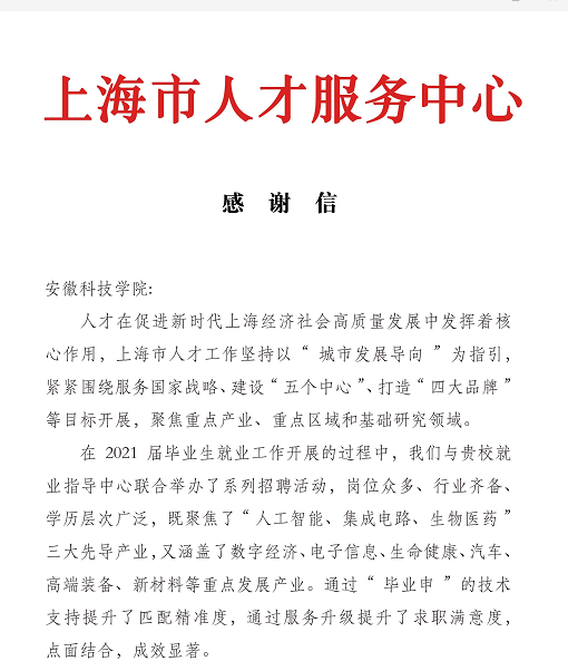 鉴于在毕业生就业、人才服务、线上与线下双向互动,以及信息共享等方面卓有成效的合作,上海市人才服务中心专门向乐鱼平台_乐鱼(中国)一站式服务平台发来感谢信。感谢乐鱼平台_乐鱼(中国)一站式服务平台统筹疫情防控和就业服务,通过理念提升、科学布局、主动作为,取得了人才与就业工作的双赢,为就业大局稳定和上海人才合作做出的积极贡献。