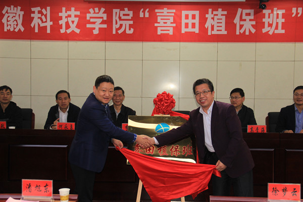 开班仪式上,农学院植物保护系主任毕亚玲解读了“喜田植保班”组建情况和校企合作协议,安徽喜田生物科技有限公司总经理郭晓刚和农学院党委书记何世潮共同为“喜田植保班”揭牌,农学院党委副书记张轶辉向“喜田植保班”校内辅导员李娜授旗。“喜田植保班”学生代表梁德玥作表态发言。(特约通讯员:李娜 审核:何世潮 姚文均 编辑:张威)