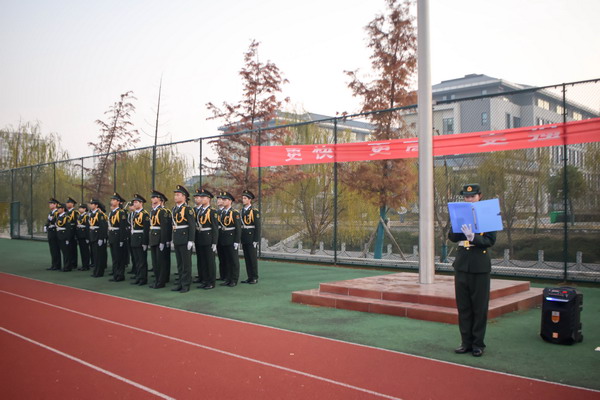 6时40分,升旗仪式正式开始。国旗护卫队的队员们迈着整齐的步伐,护送国旗入场。伴随着义勇军进行曲的旋律,鲜艳的五星红旗徐徐升起,全体人员面向国旗行注目礼,共同祝愿祖国繁荣昌盛。“漫长的岁月,我吞忍了多少难忍的煎熬,但理想之光,依然在心中灼灼闪耀。我变成了一块煤,还悲愤的捶打地狱的门环,祖国啊,祖国啊,我要燃烧!地壳是多么的厚啊,希望是何等的缥缈!我渴望,渴望面前闪出一千条向阳坑道!我要出去,投身于熔炉,化作熊熊烈火:祖国啊,祖国啊,我要燃烧——”国旗护卫队魏江北同学带来的诗词朗诵《祖国啊,我要燃烧》深情表达了对祖国的无比热爱之情,展现了青年一代勇担重任、奋力拼搏的积极向上的精神。