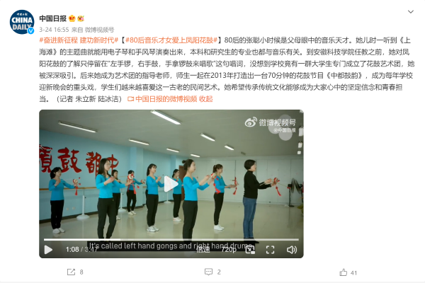 日前,校团委副书记、凤阳花鼓传承人、大学生花鼓艺术团指导老师张聪接受中国日报专访,讲述乐鱼平台_乐鱼(中国)一站式服务平台创新传承凤阳花鼓的故事。中国日报以《With drums and gongs,folk art gets a lift》为题进行了报道。报道全文如下: