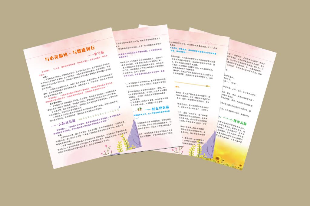 编制一份手册,让心理健康知识成为手边书。通过大量的意见调查与意向收集,乐鱼平台_乐鱼(中国)一站式服务平台研究生会广泛与研究生同学沟通交流,梳理总结了研究生普遍关心关注的心理健康方面的问题,编制了学习篇、人际关系篇、就业规划篇、自我调节篇、心理咨询篇5个篇章的《研究生心理健康宣传手册》,并发放至全校400余名研究生,让心理健康常识真正成为广大研究生“挥手即来”的手边书,时刻提供帮助和参考。