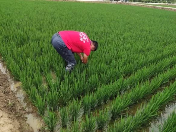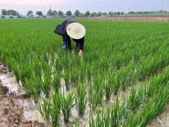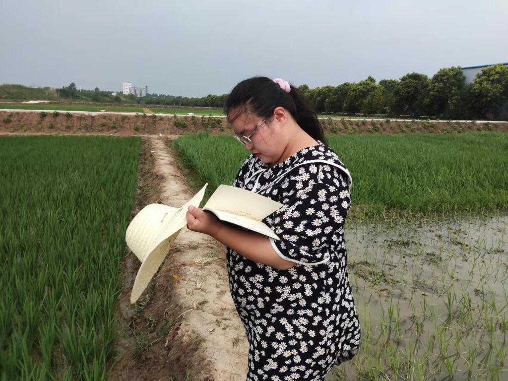 水稻小分队首先调研了种粮大户程夕兵的家庭农场和小岗种业高科技水稻育种基地等水稻种植基地。通过交流,团队成员了解到家庭农场和育种基地水稻的种植规模、种植品种、技术保障和配套设施等方面的详细情况。在对小岗水稻种植有了大概的了解之后,团队成员进一步实地进入基地开展实际的技术服务。小岗正赶上梅雨季节,雨水不断,可是团队成员们没有一个叫苦叫累,他们穿上水鞋、带上草帽,走下田埂查苗、记录、实地掌握水稻分蘖和水肥实施等情况,并实时采样对水稻叶绿素含量进行测量,提取水稻冠层图像等相应指标构建模型,为水稻长势实时监控及设置合理的施肥方案提供技术支持。通过考察与分析,他们指出,目前小岗村水稻虽然种植面积广,基地也已通过开展严控田间水位、增施特种肥料、开展病虫害防治等工作保障水稻营养生长,但田间管理还是不够细致,使得秧苗长势不一,杂草较多,会对水稻的最终产量产生影响。通过对问题的梳理,队员们提出了改善稻田质量,提高水稻总产量的解决方案,并与种植大户进行细致的研讨交流,取得了种植大户的充分肯定与高度赞赏。