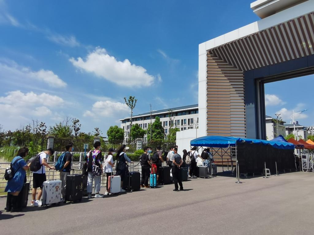 来校报到研究生在校门依次查验健康码、行程码、核酸检测报告,进行体温检测、行李消毒、摘换口罩等工作,确保疫情防控工作落到实处。在迎新志愿者的引领下,认真提交和核验各项入学报到材料。