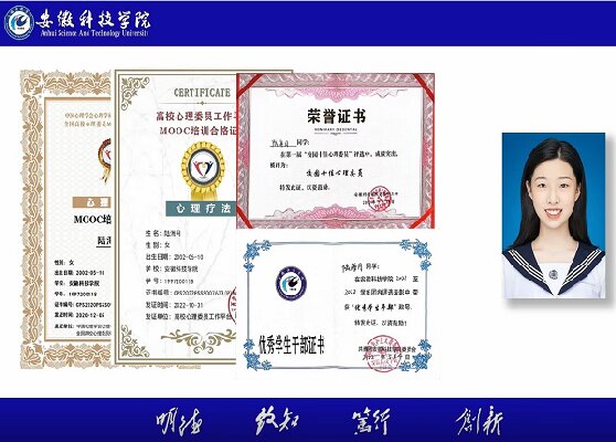 陆海月同学在担任心理委员期间,广泛学习各类心理知识,关注同学心理状态,多次协助人文学院开展“四类”重点关注学生的心理排查活动,定期举办心理主题班会,组织学生参加心理培训讲座、校园心理情景剧大赛及心理知识竞赛等系列活动 30 余次。在认真完成心理委员工作的同时,陆海月同学还注重全面发展,学业成绩优异,连续两年获国家励志奖学金、校“三好学生”称号,获校优秀学生一等奖学金、二等奖学金,获得校“优秀学生干部”、“校园十佳心理委员”、新媒体中心“先进个人”、人文学院“学生会先进个人”等荣誉称号。
