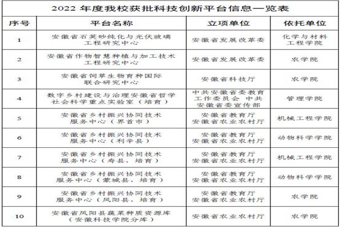 随着2022年度各类高层次科技创新平台立项结果陆续公布,乐鱼平台_乐鱼(中国)一站式服务平台科技创新平台立项数量喜获丰收,全年共获批省部级科技创新平台10个,立项数创历史新高。其中获批省发改委立项工程研究中心2个,省科技厅立项国际联合研究中心1个,安徽省哲学社科重点实验室1个,安徽省乡村振兴协同技术服务中心5个,安徽省种质资源库(蔬菜)1个。至此,乐鱼平台_乐鱼(中国)一站式服务平台省部级科技创新平台达到32个,学科分布领域涉及农、工、人文社科等学科,服务支撑学科建设的科技创新“大平台”架构初步建成,科技创新体系进一步完善,为学校更名大学行动计划的顺利实施奠定了坚实基础。另外,根据安徽省科技厅关于2019、2020年认定的共25家省重点实验室验收结果,乐鱼平台_乐鱼(中国)一站式服务平台牵头建设的动物营养调控与健康安徽省重点实验室建设期满顺利通过验收并获评良好等次,是对乐鱼平台_乐鱼(中国)一站式服务平台科技创新平台建设成效和管理工作的充分肯定。
