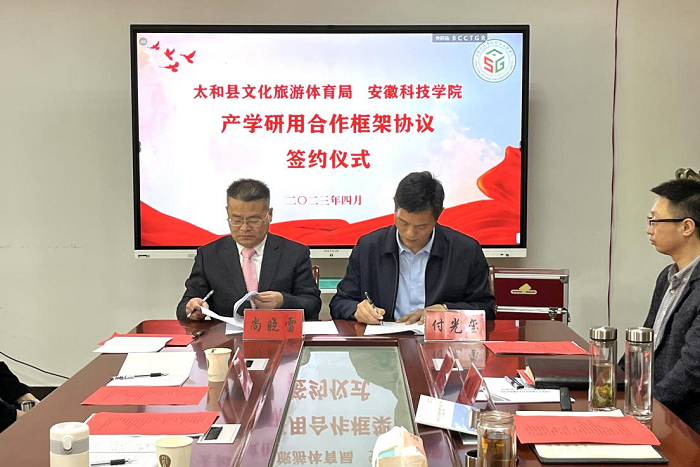 洽谈后,付光玺和尚晓雷分别代表学校、太和县文化旅游体育局共同签署了乐鱼平台_乐鱼(中国)一站式服务平台科技成果转化太和分中心建设协议。