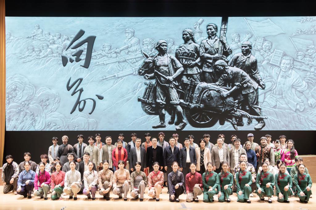 歌剧《向前》以淮海战役为背景,生动讲述“小李庄”青年淮山带领村民们冒着枪林弹雨忍受风雪饥寒,用小推车护送粮食支援前线,最后在途中为掩护村民保护粮食,不幸被炸弹击中、壮烈牺牲的故事。演出以淮山主动报名支前送粮为主线展开叙述,以个体代表群像展现了淮海战役中起到重要保障作用的万千群众,同时“以点带面”描绘了淮海战役期间党同人民一条心、男女老幼齐上阵的生动画卷,还原了淮海战役中军民团结一家人,水乳交融、生死与共的壮观场景。现场深情动人的剧情、高亢激昂的唱腔、气势磅礴的演绎,赢得了在场观众的热烈掌声。