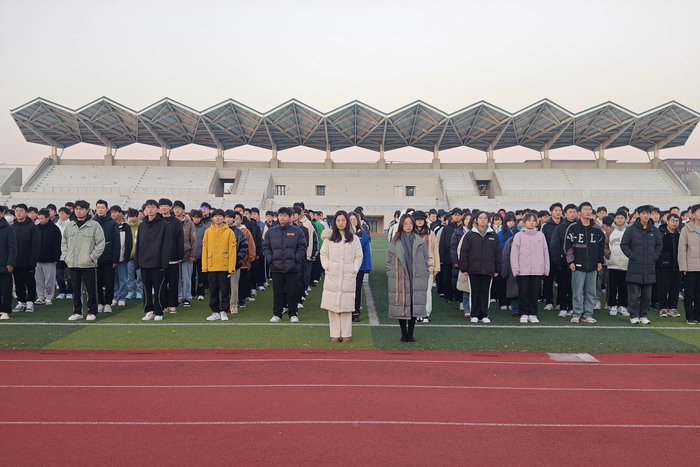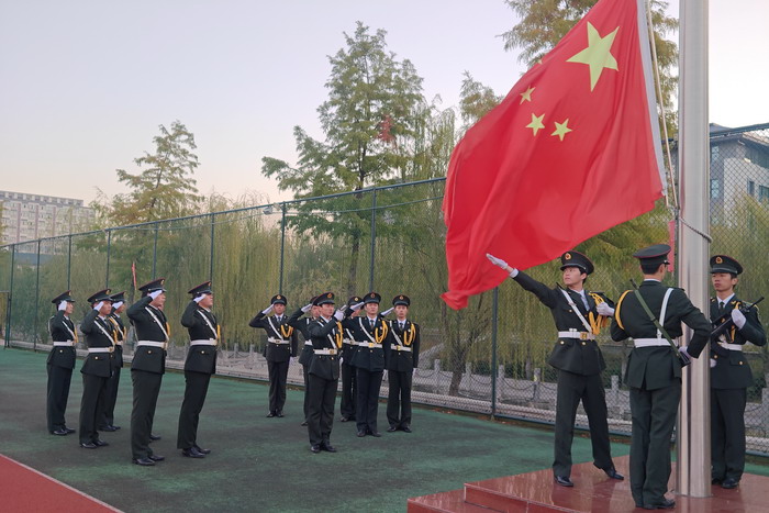 不惧初冬的寒冷,怀揣始终如一的敬仰,校国旗护卫队队员们目光坚定,步伐铿锵有力,护送着五星红旗来到国旗台前。“升国旗,奏唱国歌!”嘹亮的国歌声响起,擎旗手扬出那一抹鲜艳,让它随晨风倏地铺展开来,冉冉升起。全体师生肃立,面向国旗行注目礼。