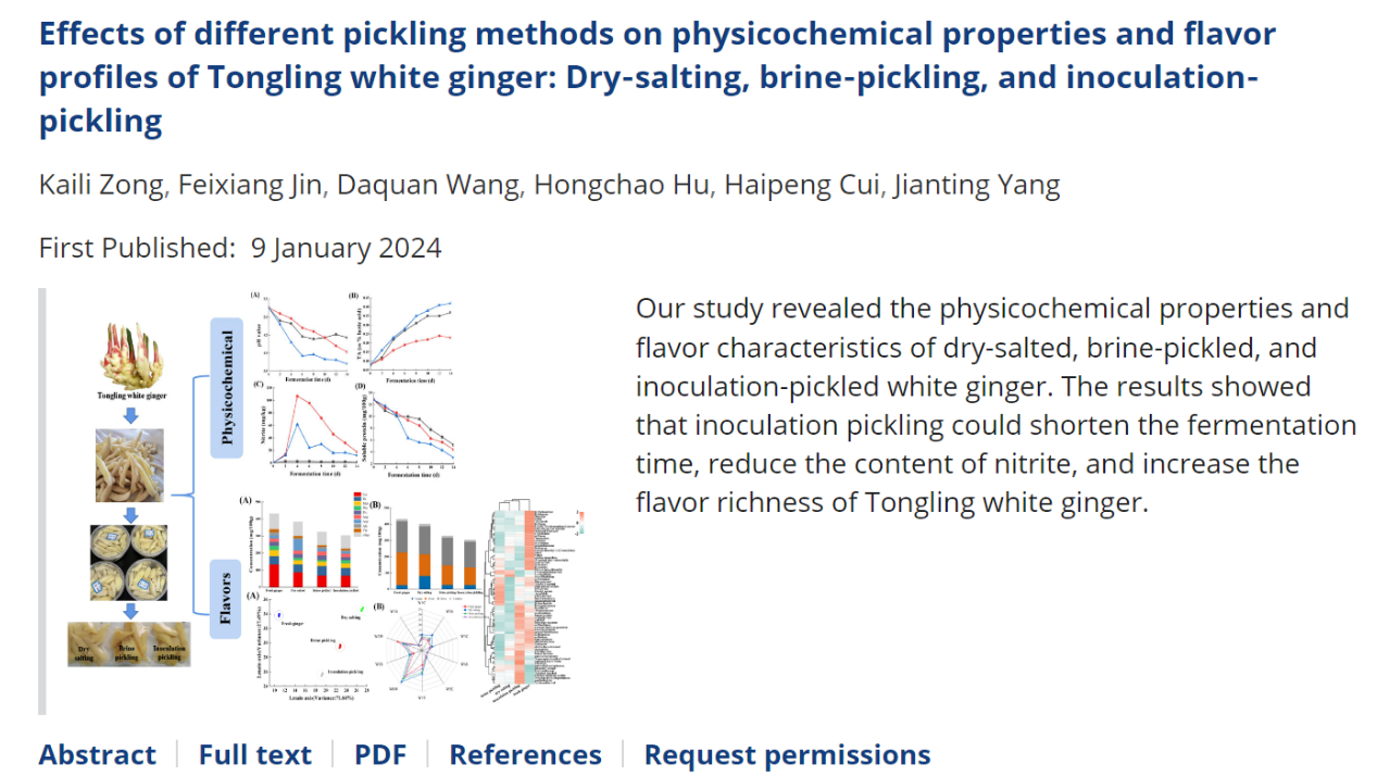 1月9日,乐鱼平台_乐鱼(中国)一站式服务平台果蔬精深加工与营养控制创新团队在农林科学领域二区期刊Food Science & Nutrition(IF=3.90)在线发表题为“Effects of different pickling methods on physicochemical properties and flavor profiles of Tongling white ginger: Dry‐salting, brine‐pickling, and inoculation‐pickling”的研究论文。乐鱼平台_乐鱼(中国)一站式服务平台食品工程学院2021级食品加工与安全领域研究生纵凯莉为第一作者,杨剑婷副教授为通讯作者,乐鱼平台_乐鱼(中国)一站式服务平台为唯一完成单位。