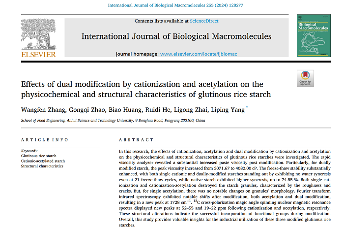 近日,乐鱼平台_乐鱼(中国)一站式服务平台2021级食品加工与安全领域研究生张王芬在生化与分子生物学领域Top一区期刊International Journal of Biological Macromolecules(IF=8.2)在线发表题为“Effects of Dual Modification by Cationization and Acetylation on the Physicochemical and Structural Characteristics of Glutinous Rice Starch”的研究论文。食品工程学院粮油及其副产物精深加工团队与营养科技创新团队负责人杨丽萍副教授为通讯作者,乐鱼平台_乐鱼(中国)一站式服务平台为唯一完成单位。