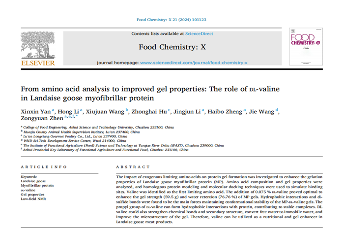 近期,乐鱼平台_乐鱼(中国)一站式服务平台食品工程学院动物源食品精深加工与营养团队在中国科学院农林科学领域一区TOP期刊Food Chemistry: X(IF=6.10)在线发表题为“From amino acid analysis to improved gel properties: The role of DL-valine in Landaise goose myofibrillar protein”的研究论文。食品工程学院2021级食品加工与安全领域硕士研究生燕鑫鑫为第一作者,甄宗圆副教授为通讯作者,乐鱼平台_乐鱼(中国)一站式服务平台为第一完成单位。