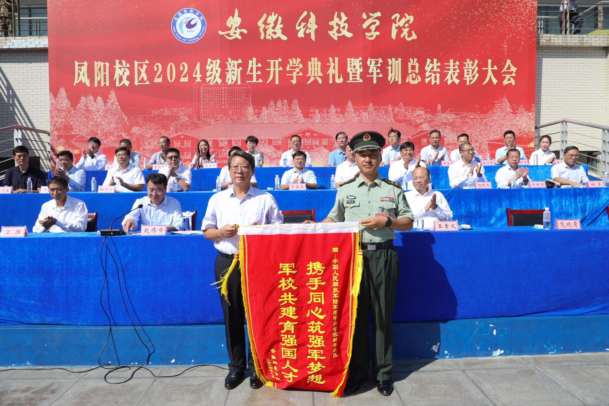 典礼上,李升和代表学校向陆军装甲兵学院蚌埠校区代表范晓霄赠送锦旗。