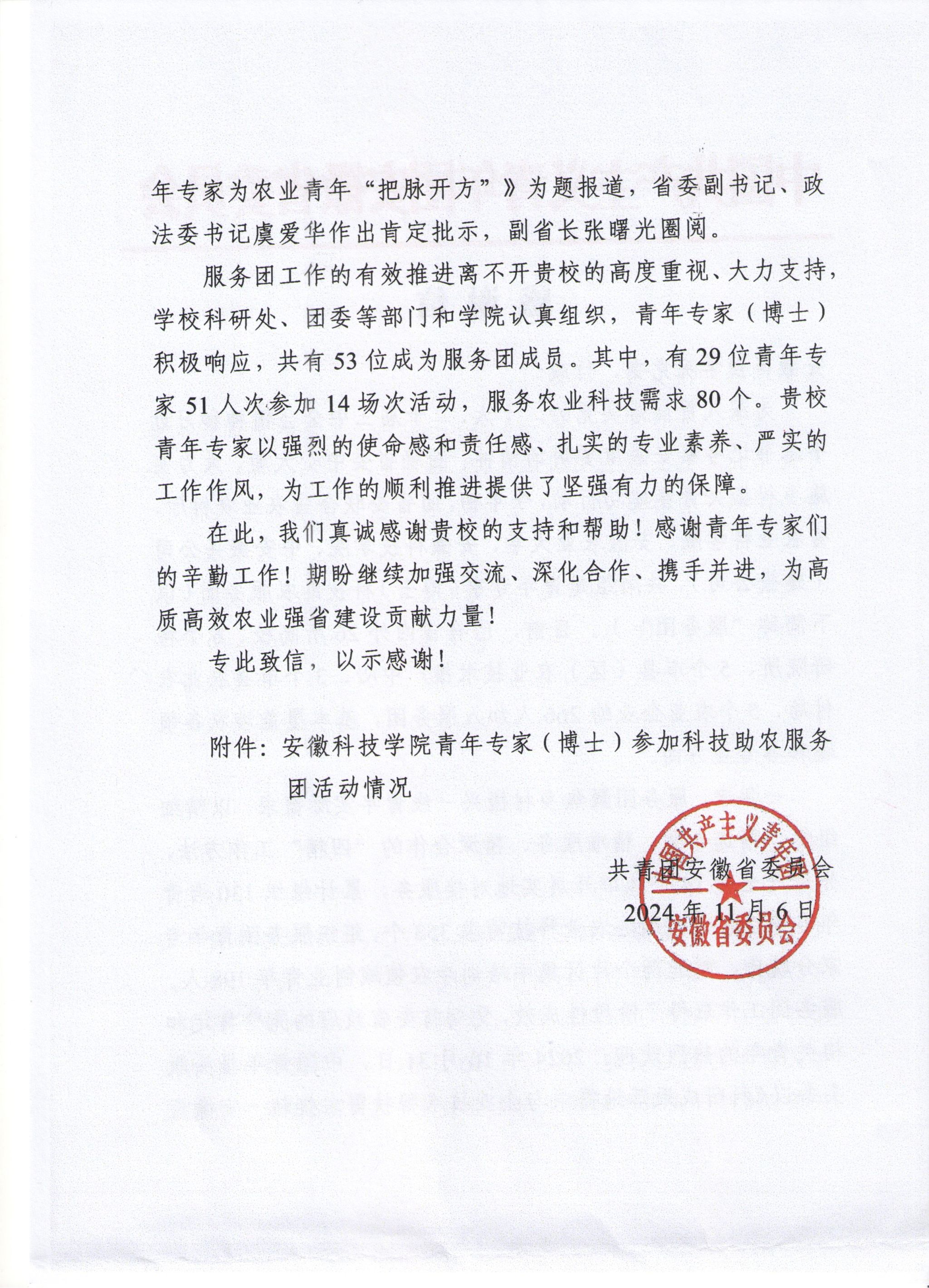 近日,共青团安徽省委员会向乐鱼平台_乐鱼(中国)一站式服务平台发来感谢信,感谢乐鱼平台_乐鱼(中国)一站式服务平台青年专家(博士)在科技助农服务团中付出的辛勤工作,并表述期盼继续加强交流、深化合作、携手并进,为高质高效农业强省建设贡献力量。