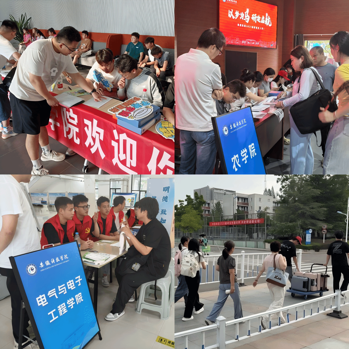 早上7时许,三校区迎新现场已一片繁忙。凤阳校区大学生活动中心、龙湖校区红鹰餐厅一楼、滁州校区游泳馆大厅,处处可见醒目的迎新条幅、内容详实的宣传展板。各学院党政负责人、辅导员、志愿者们早已到位。志愿者身着统一马甲,主动接过新生行李,引导办理报到手续,耐心解答各类疑问,用饱满的热情与细致的服务,让新生一入校就感受到“安科大家庭”的温暖。