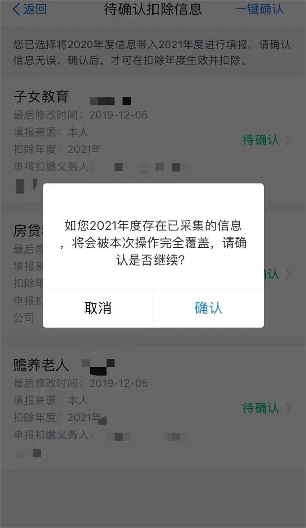 注意!由于个人所得税专项附加扣除内容事关纳税人的税收负担,所以即使2021年度的附加扣除内容和2020年一样,纳税人也需要点击确认,这样扣缴义务人才能在2021年1月份完成相关的扣除。
