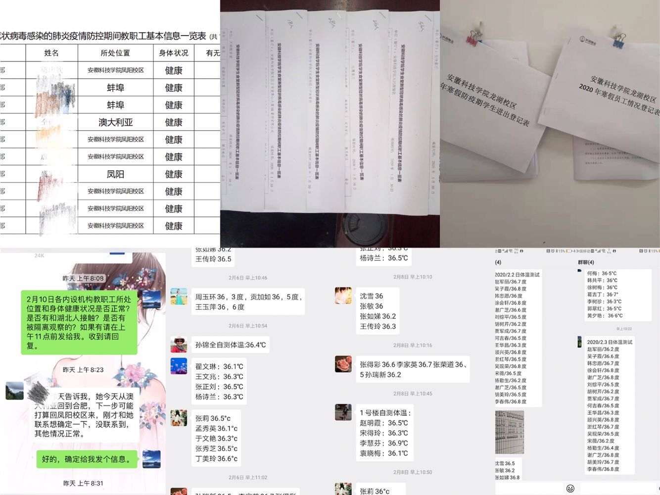 为了做好管控排查工作,后勤保障部对所有在职在岗职工、服务企业人员按照网格化管理方式,明确了排查责任人,逐一排查并掌握他们春节期间的去向、接触人群、所在位置和身体健康状况等信息,并对各类人员分别建立了微信群,随时掌握信息动态,及时将上级及学校要求、疫情防控形势等进行传达贯彻。落实“日报告”和“零报告”制度,安排专人做好人员信息排查上报工作,确保信息的全面、及时和准确。