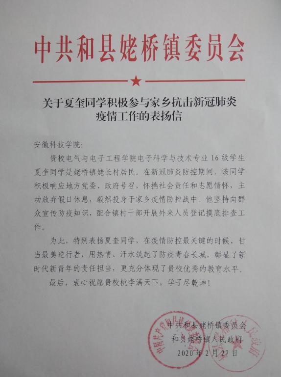 谈到夏奎,村支书夏发平兴奋地说:虽说自己平时走街窜巷,但这段时间工作量也有点让吃不消,没想到夏奎却没说苦与累,从夏奎身上看到了成长起来的年轻人身上的一种责任担当。2月27日,中共和县姥桥镇委员会致函乐鱼平台_乐鱼(中国)一站式服务平台表扬夏奎在疫情防控关键的时候,甘当最美逆行者。