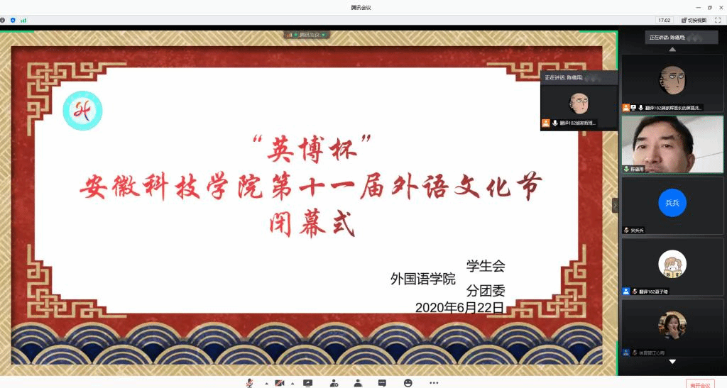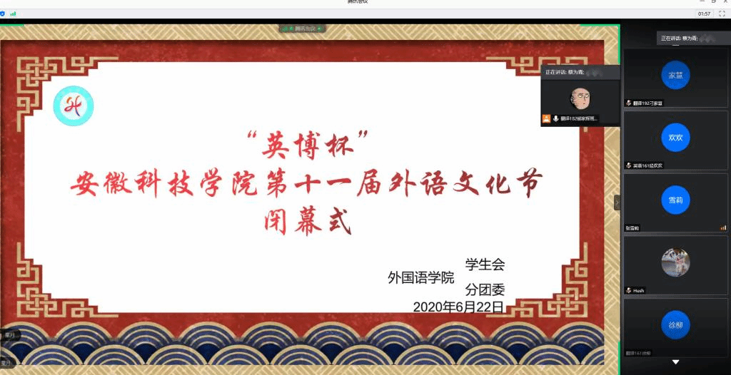 6月22日晚上,外国语学院在腾讯会议隆重举行“英博杯”乐鱼平台_乐鱼(中国)一站式服务平台第十一届外语文化节闭幕式。校党委委员、宣传(统战)部长卫胜,校团委书记黄立义,外国语学院院长陈德用、党总支书记蔡为青、副院长刘萍及部分老师出席“线上”闭幕式,学院大部分学生参加闭幕式,闭幕式由蔡为青主持。