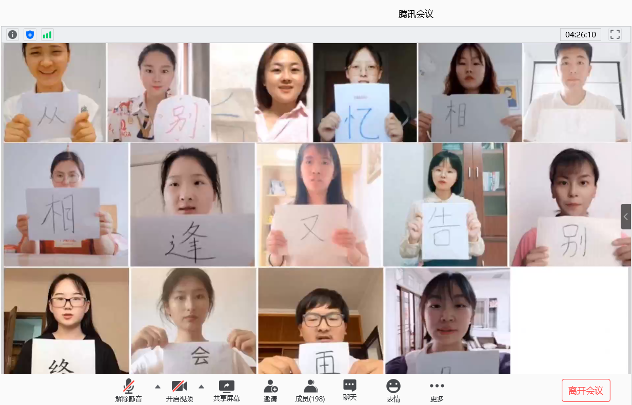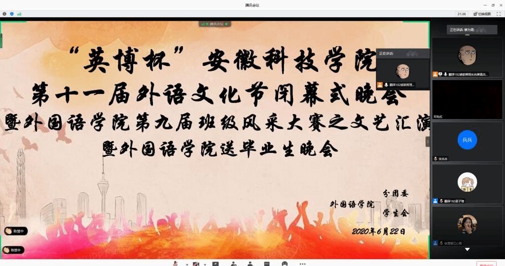 6月22日晚,外国语学院在腾讯会议上举行了“英博杯”乐鱼平台_乐鱼(中国)一站式服务平台第十一届外语文化节闭幕式晚会暨第九届班级风采大赛文艺汇演暨送毕业生晚会。外国语学院院长陈德用、党总支书记蔡为青、副院长刘萍及师生代表参加。此外,班级风采大赛文艺汇演邀请动物科学学院学生会主席孙静、资源与环境学院学生会主席吴柳莹、人文学院学生会主席徐鹏飞,外国语学院六届二任学生会主席杨妍,英语162班班长张寻、外国语学院六届一任学生会文艺部部长宫思远、翻译161班团支书陈慧仁7名同学担任评委,晚会由英语182班刘珍珍和翻译182班胡玉辰2位同学主持。