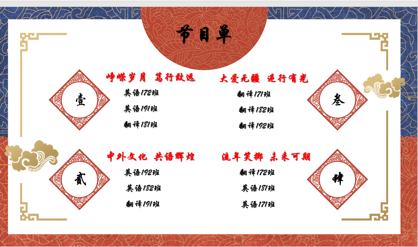 本次晚会分为“峥嵘岁月,笃行致远”,“中外文化,共语辉煌”,“大爱无疆,逆行有光”,“流年笑掷,未来可期”四个篇章,17、18、19级各班级各显神通,围绕主题,准备节目。第一篇章中英语172班、英语191班、翻译181班将所有对祖国的感激之情融入歌曲,朗诵、舞蹈,给祖国最真挚的祝愿,同学们也在评论留言区表达了对节目的赞许和对祖国的热爱!第二篇章中英语192班、英语182班、翻译191班,分别向我们展示了对中外文化的见解,拓宽国际视野。第三篇章中翻译171班、翻译182班、翻译192班,分别用他们的方式向我们展示了全国人民同呼吸共命运的艰辛历程,展示了祖国的强大,展示了对逆行者和所有医护人员深深的感激和敬仰之情。第四篇章中翻译172班、英语181班、英语171班,用他们独特的方式向学长学姐们表达了最最真诚的祝福。希望学长学姐们前程似锦,走出半生,归来仍是少年。