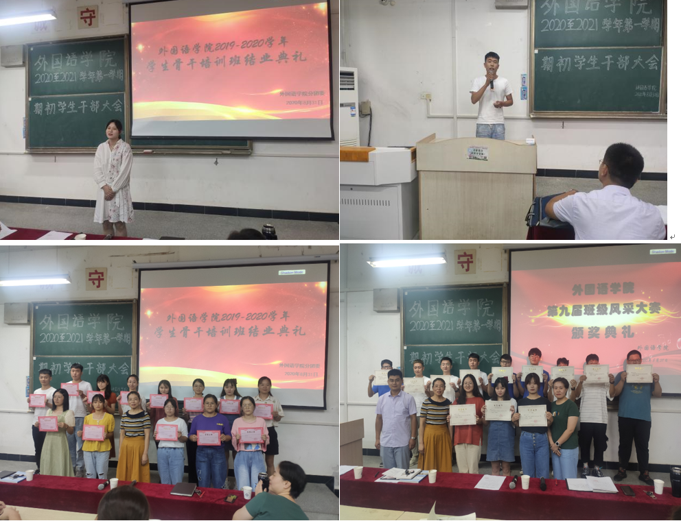 第二阶段为外国语学院2019至2020学年学生骨干培训班结业典礼,陈慧中老师宣读优秀学员名单,几位学员代表上台分享心得体会,蔡为青和陈慧中分别给获奖个人颁奖,希望他们再接再厉,最后进行合影留念。