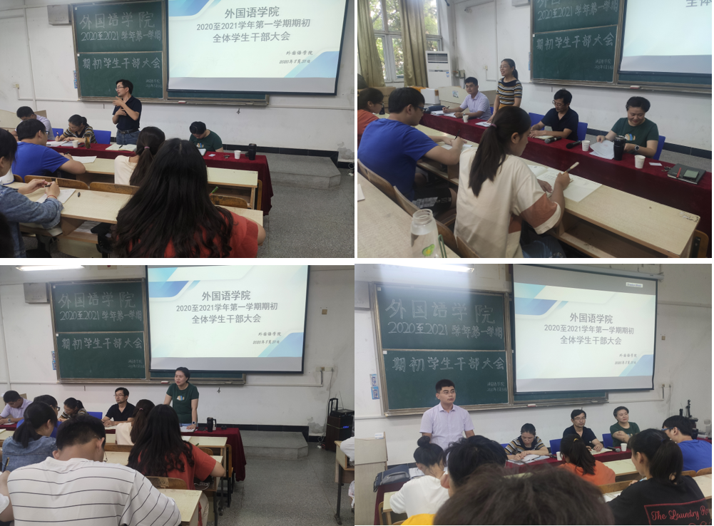 8月31日下午,外国语学院于求知楼A座105教室召开外国语学院2020至2021学年第一学期期初全体学生干部大会。外国语学院院长陈德用、外国语学院党支部书记蔡为青、外国语学院分团委书记陈慧中、专职辅导员宋兵兵、学院分团委全体成员,学院学生会、易班工作站全体成员,各班级主要学生干部参会,大会由蔡为青主持。