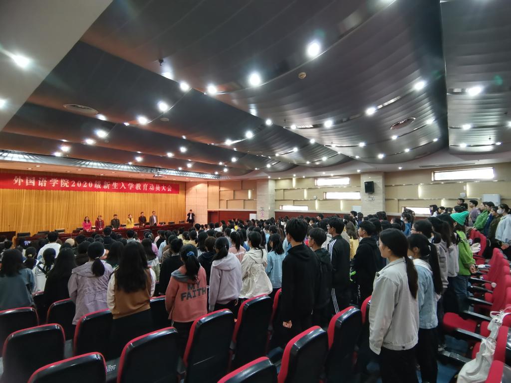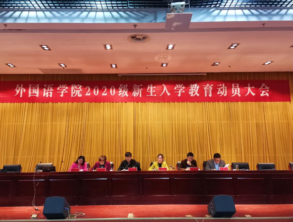丹桂飘香,金秋送爽。20级新生带着青春的活力,带着对知识的不懈追求,带着对大学校园生活的无限憧憬,迈进了乐鱼平台_乐鱼(中国)一站式服务平台外国语学院。为了让新生更快适应新环境,适应新的生活,顺利、平稳、有效地进入大学生活。10月21日下午14:00,外国语学院在新图书馆第二报告厅举行了新生入学教育动员大会。外国语学院院长陈德用、党总支书记蔡为青、副院长刘萍、教学秘书周海平、英语专业教研室主任兼英语专业负责人洪民老师、翻译专业教研室主任兼翻译专业负责人邓兆红老师、分团委书记陈慧中、专职辅导员宋兵兵,学院教师代表,全体20级新生参会,大会由刘萍主持。