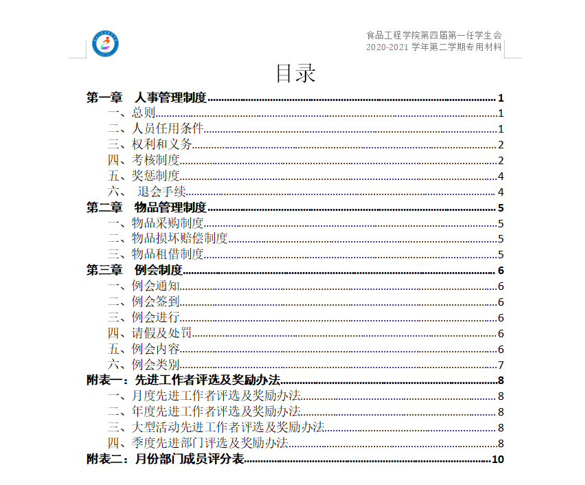 在制度上,食品工程学院学生会不断完善,在落实食品工程学院学生干部管理制度的前提下,积极探索适用于学生会情况的有效制度,制定了涵盖“人事管理”、“物品管理”、“例会制度”、“先进工作者评选及奖励办法”四个方面的《食品工程学院学生会规章制度》,在一年里,学生会积极落实各项管理规定,从严治会。
