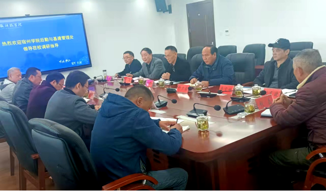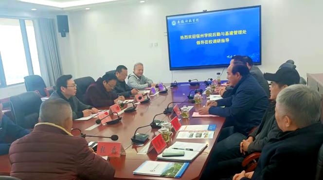 11月11日,宿州学院后勤与基建管理处副处长孙继军、后勤与基建管理处副处长周霁野、后勤与基建管理处饮食服务监管中心主任马庆功、后勤与基建管理处医疗保健服务保障中心主任曹少飞、后勤与基建管理处水电管理与节能中心科员卢友福等一行7人来乐鱼平台_乐鱼(中国)一站式服务平台考察交流,后勤保障部副主任谷凯、副主任柳卫国、校医院院长曹军、饮食服务监管中心主任叶浩、公寓管理服务中心主任张东晓、水电管理与节能中心主任李宏根、后勤保障部物业服务监管中心主任张磊等热情接待来访宾客,交流会议由谷凯主持。