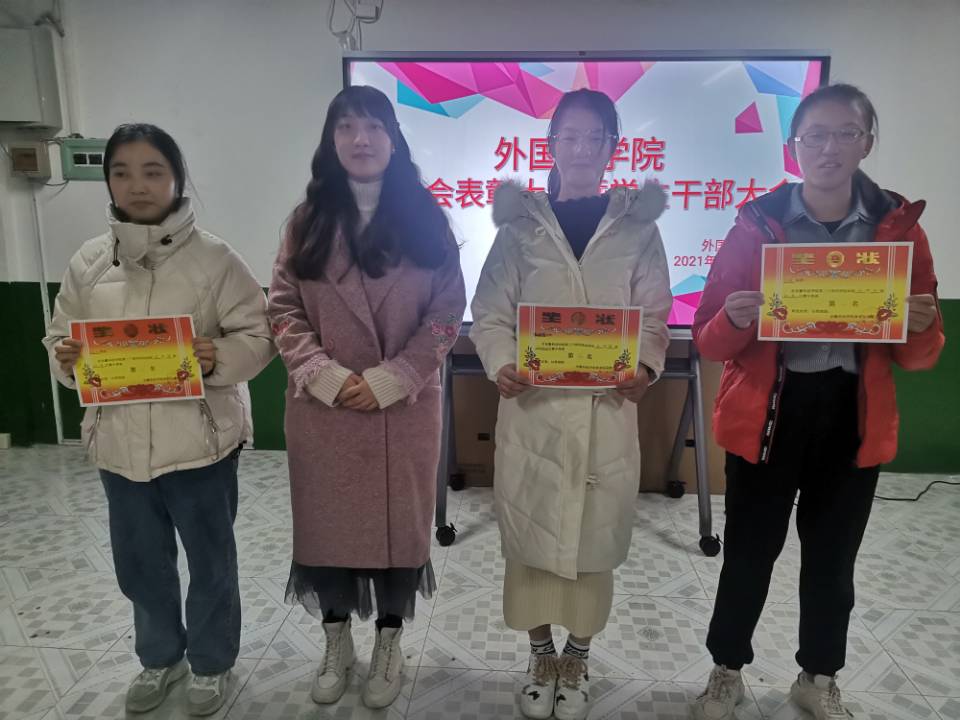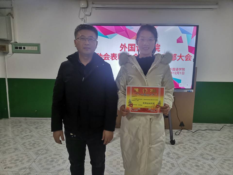 在干部大会上,陈慧中、宋兵兵、张薇薇分别布置了各自分管的工作,如:奖学金使用管理、安科E创项目申报、安全稳定、疫情防控、学风建设、意识形态、外语文化节闭幕式晚会、学籍异动等内容。在表彰会议上,与会老师们为获奖运动员颁发奖状并合影留念。宋兵兵宣读了《外国语学院学生在乐鱼平台_乐鱼(中国)一站式服务平台第30届运动会的通报表扬名单》,张薇薇宣读《外国语学院在校第30届运动会中获奖运动员名单》,院学生会执行主席桂纪昌对本次校运动会进行了总结发言。
