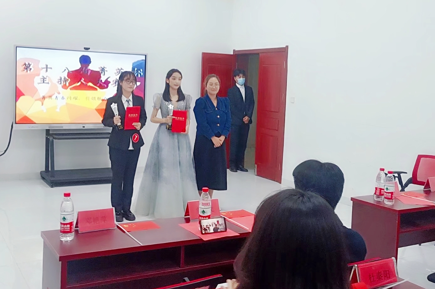 经过激烈的角逐,章思佳荣获决赛一等奖,梅静怡、王梦雨荣获决赛二等奖,朱平磊、周辰星、徐鹿萍荣获决赛三等奖。詹学文、张古品与人文学院学生会主席杜秦阳分别为选手们颁发了奖杯与证书并合影留念。比赛环节结束后,詹学文对本届菁英杯举办历程进行了回顾,也对各位选手的精彩表现做了点评,指出了他们的优点及不足之处,同时对没有获奖的选手进行了鼓励,希望大家再接再厉,更上一层楼。