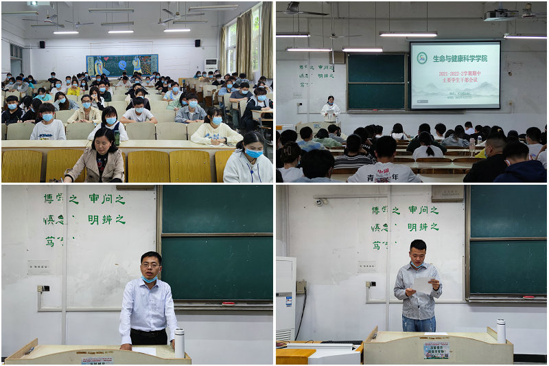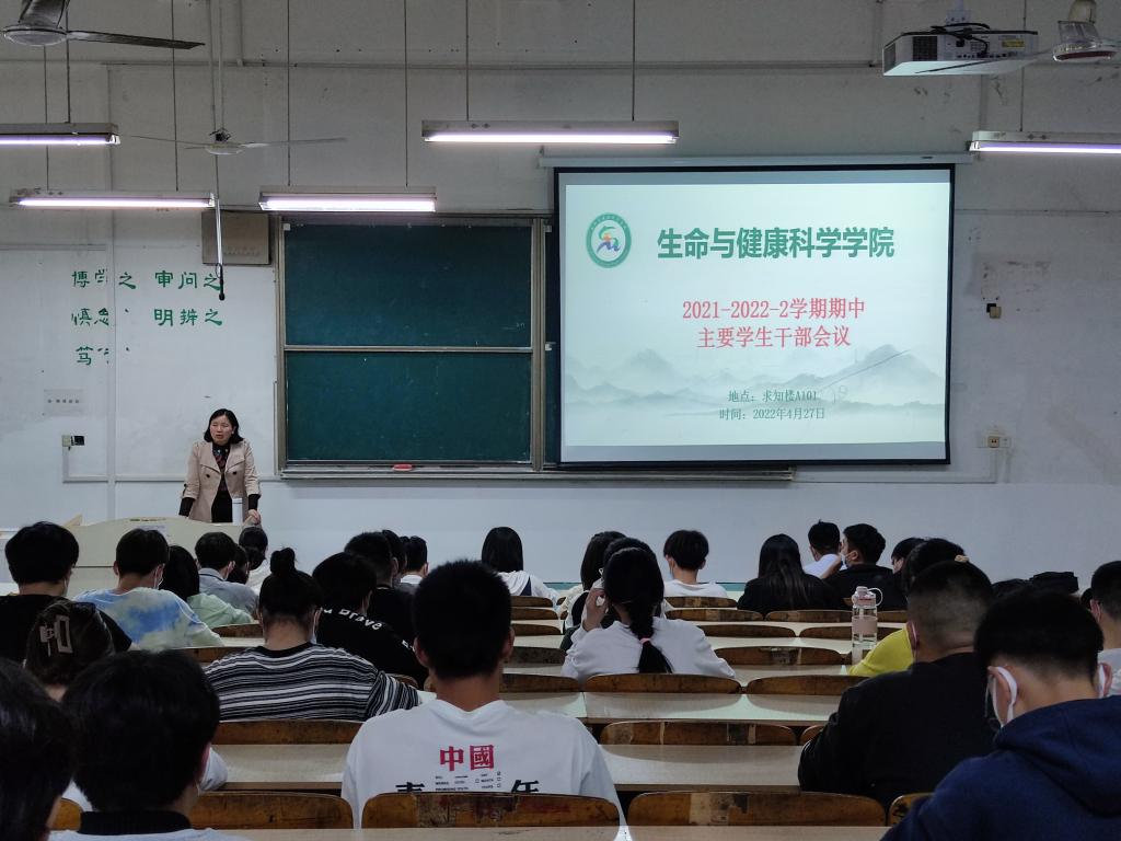 4月27日下午,生命与健康科学学院于求知楼A101教室召开期中学生干部会议。学院党委副书记彭丽萍、团委副书记姜毅、副科级辅导员刘国祥出席会议。各班级班长、团支书,学生会、团委、易班主要负责干部代表参会。会议由刘国祥主持。
