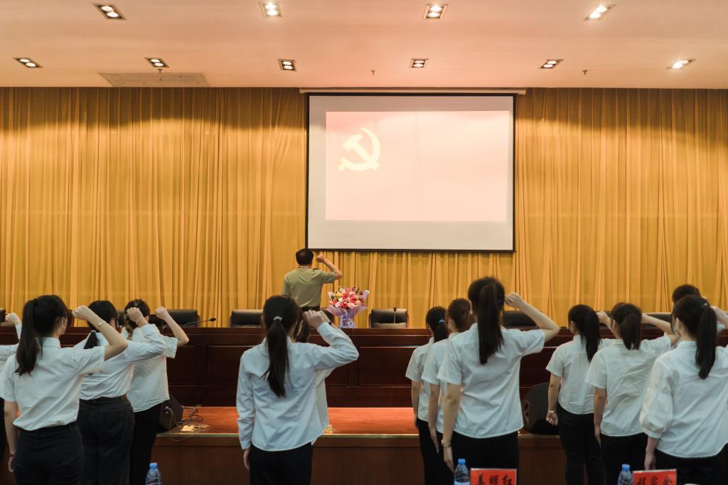 报告会后,人文学院举行了2022年上半年新发展学生党员入党宣誓仪式,由郑世柱同志带领宣誓。19名新发展党员在领誓人的带领下,高举右臂,紧握右拳,郑重宣誓:“我志愿加入中国共产党……”誓言铿锵,一声声回荡在所有预备党员的心中。用出色的表现迎接新学期的学习和工作的决心。