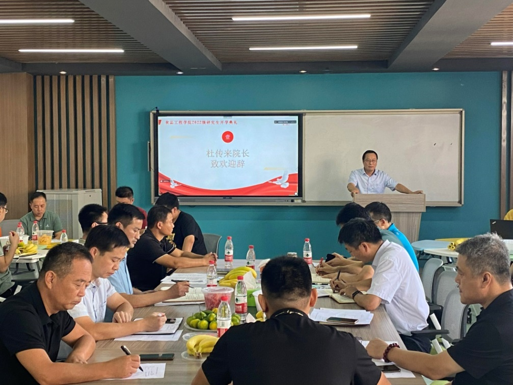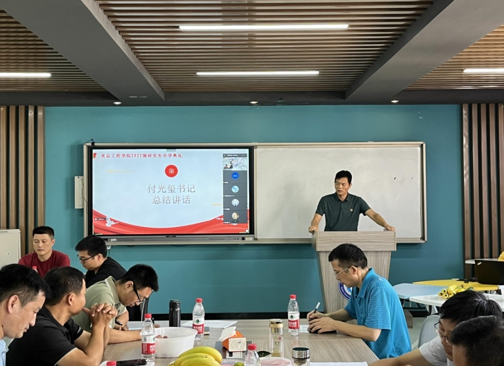 9月7日下午,食品工程学院2022级研究生开学典礼在智慧教室求知楼B309举行。本次典礼采用线上与线下相结合的方式进行。校党委研究生工作部部长张春雨、食品工程学院党委书记付光玺、院长杜传来、副院长翟立公、副院长郑海波、研究生秘书彭钢、2022级研究生辅导员桑宏庆、全体研究生导师及2022级全体研究生参加。典礼由学院党委副书记、纪委书记王广良主持。