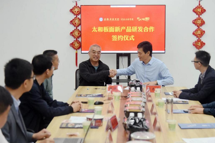 在安徽太板一号食品科技有限公司,付光玺一行与公司董事长胡洪彬、总经理魏继棠深入探讨合作机制。胡洪彬介绍了公司的发展历程、公司研发的太和板面系列产品,并就速食板面加工过程中遇到的技术难题与参会专家进行了深入的探讨。最后双方在太和板面功能性成分分析、板面调料包防腐保鲜、制定速食板面的行业标准等方面达成合作,现场签订了太和板面新产品研发合作协议,举行了乐鱼平台_乐鱼(中国)一站式服务平台食品工程学院大学生实习实训基地揭牌仪式。